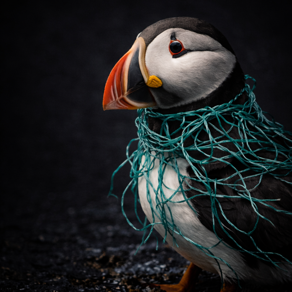 False Catch Project was created in response to the growing environmental crisis affecting puffins and other marine wildlife. Every year, discarded fishing nets, plastic debris, and microplastics enter the ocean, creating silent dangers in their natural habitat. Many seabirds mistake plastic for food, others become trapped in abandoned fishing gear, often with fatal consequences.